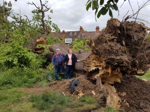 The owners of the allotment, Alex and Neil Sibley explained that it had been raining, there were gusting winds, and some of the now exposed roots appear to have rotted. Only a few minutes earlier their children were playing on a swing hanging from one of the branches. Luckily they had gone back into their house on Woodfield Crescent when the tree fell, thus avoiding what could have been a terrible tragedy.