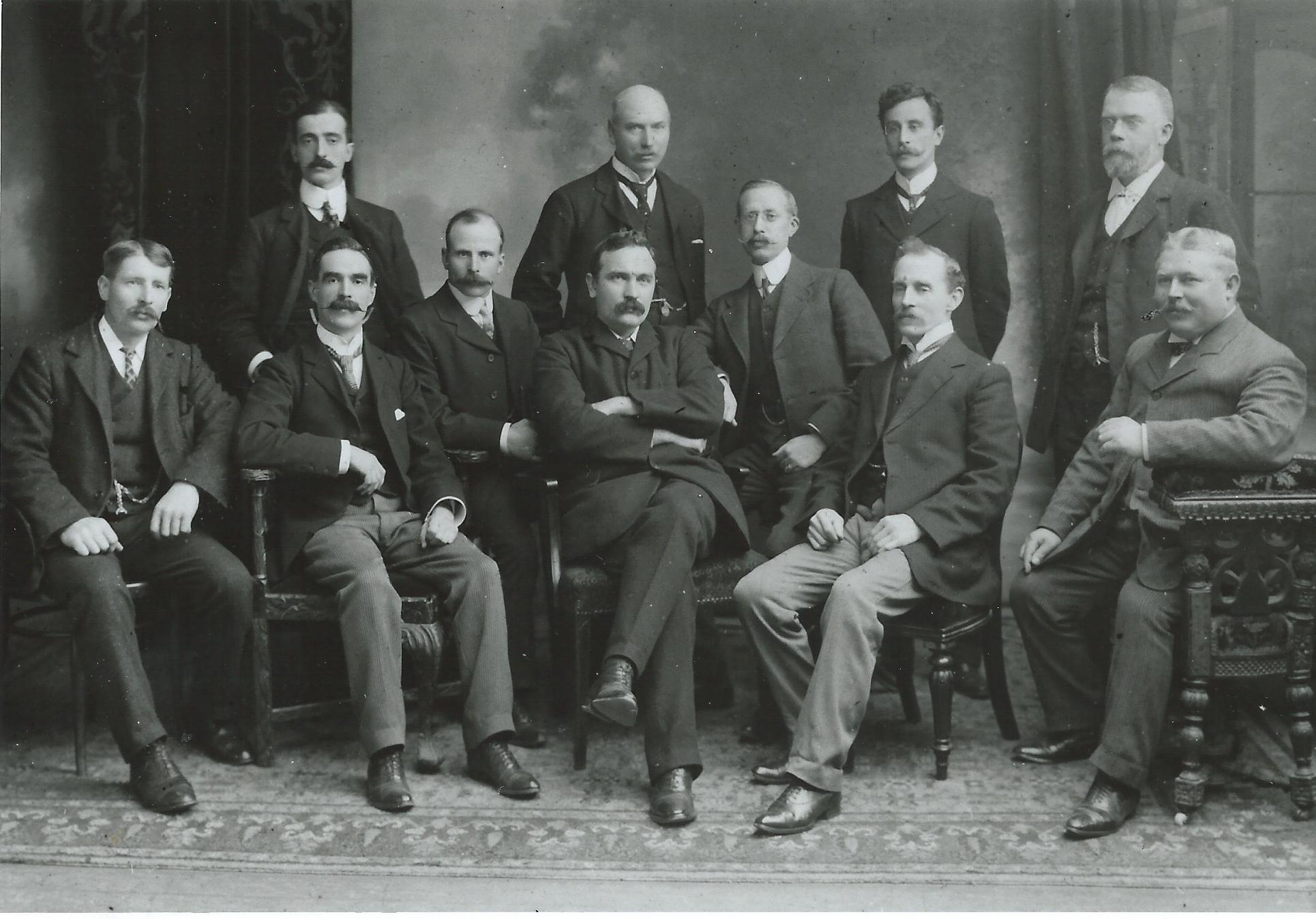 Henry Vivian (seated centre), Harry C. Perry (left of and slightly behind Vivian), Hubert Brampton (front row, right of Vivian), William Hutchings (seated 2nd from left), Fred Watts (seated far right), Fred Litchfield (standing far right).