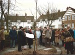 A ceremony to mark the replanting,watched by 30-40 residents, took place at the corner of Brentham Way/Fowlers Walk on 13th February 1988 at which the Mayor of Ealing “planted” an oak tree and unveiled a plaque to commemorate the occasion.